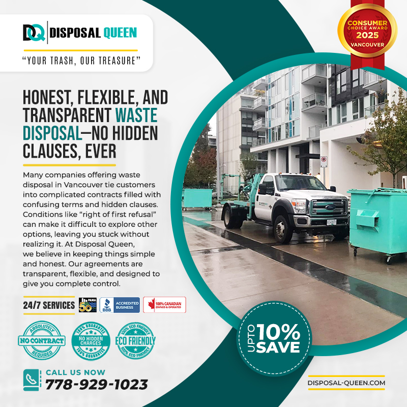 Many companies offering waste disposal in Vancouver tie customers into complicated contracts filled with confusing terms and hidden clauses. Conditions like “right of first refusal” can make it difficult to explore other options, leaving you stuck without realizing it. At Disposal Queen, we believe in keeping things simple and honest. Our agreements are transparent, flexible, and designed to give you complete control. You’ll never find auto-renewals, fine print surprises, or unexpected fees—just straightforward pricing and dependable service. With 24/7 live customer support and convenient pickup schedules, Disposal Queen ensures your waste disposal experience is simple, transparent, and built entirely around your needs. ![]() | |