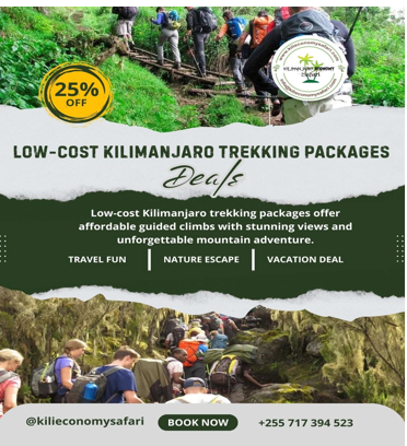 Looking for a cost-effective way to conquer Africa’s highest peak? Our low-cost Kilimanjaro trekking packages give you all the essentials needed for a successful and memorable climb. We provide certified mountain guides, full porter support, nutritious meals, park fees, tents, and daily health checks to ensure your safety and comfort. Ideal for backpackers and budget adventurers, our group treks help reduce costs while offering a fun and supportive climbing experience. With years of experience, we guarantee professional service and well-planned itineraries that maximize your chances of reaching the summit. Make your Kilimanjaro dream a reality—book your affordable trek today! ![]() | |