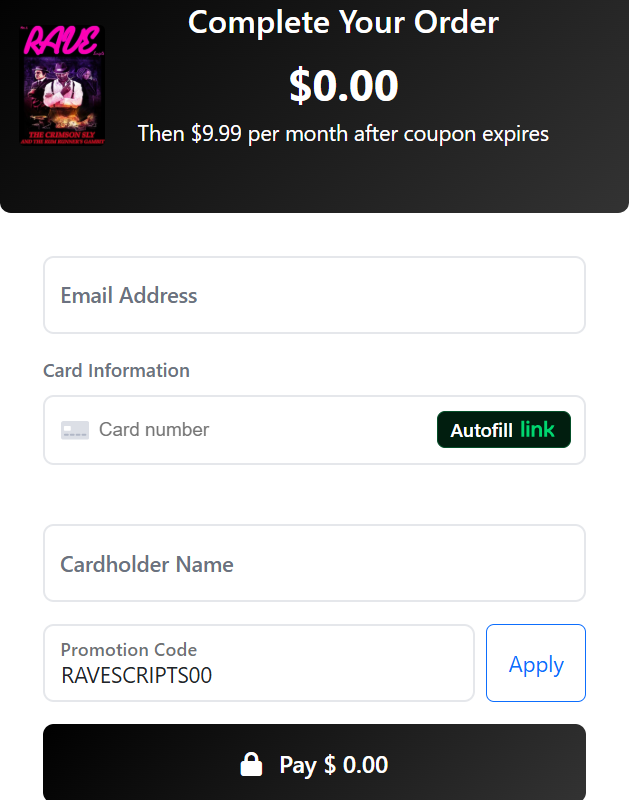 Rave Scripts: 100% Off Promo Code Subscription to Enter $15k Giveaway | |