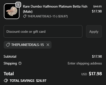 Enjoy up to 60% savings + Free Shipping at Thailand Betta Fish using code ThePlanetDeals-15. ![]() | |