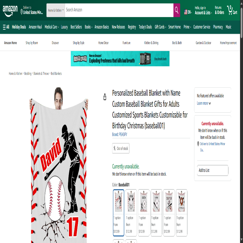 Amazon: 40% OFF Peasify Custom Baseball Blanket | |