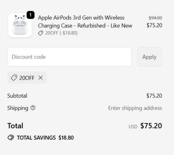 Use promo code: 20OFF at checkout to enjoy 20% OFF - Apple AirPods on SWEEP. ![]() | |