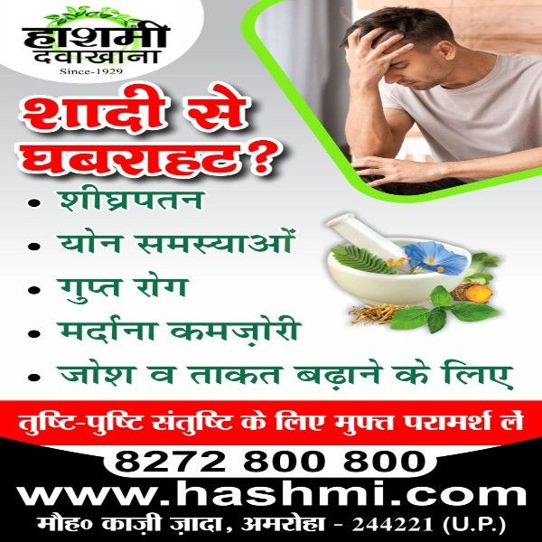 Feeling anxious about marriage or facing performance worries? Hashmi Dawakhana offers time-tested herbal remedies to help you regain confidence, energy, and strength. Our expert natural treatments address premature issues, weakness, and low vitality—helping you restore your balance and boost power naturally. Get free consultation and rediscover satisfaction in life. ![]() | |