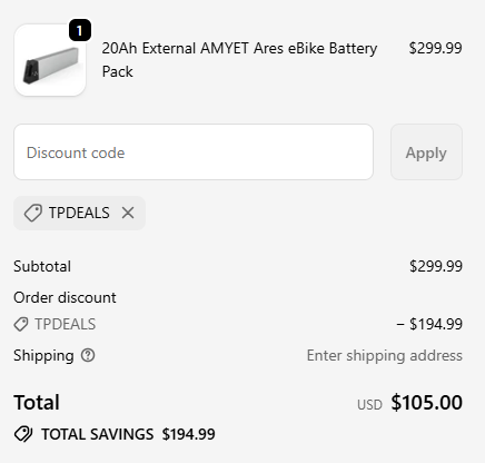 Enjoy Up To 65% savings at AMYET eBikes using code TPDEALS. ![]() | |
